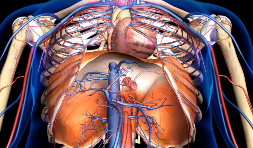 肋骨(ろっこつ)間にある肋間筋は呼吸筋、深呼吸をする時に動く筋肉です。そしてお腹の中にある、横隔膜があります。横隔膜は最大の呼吸筋です。